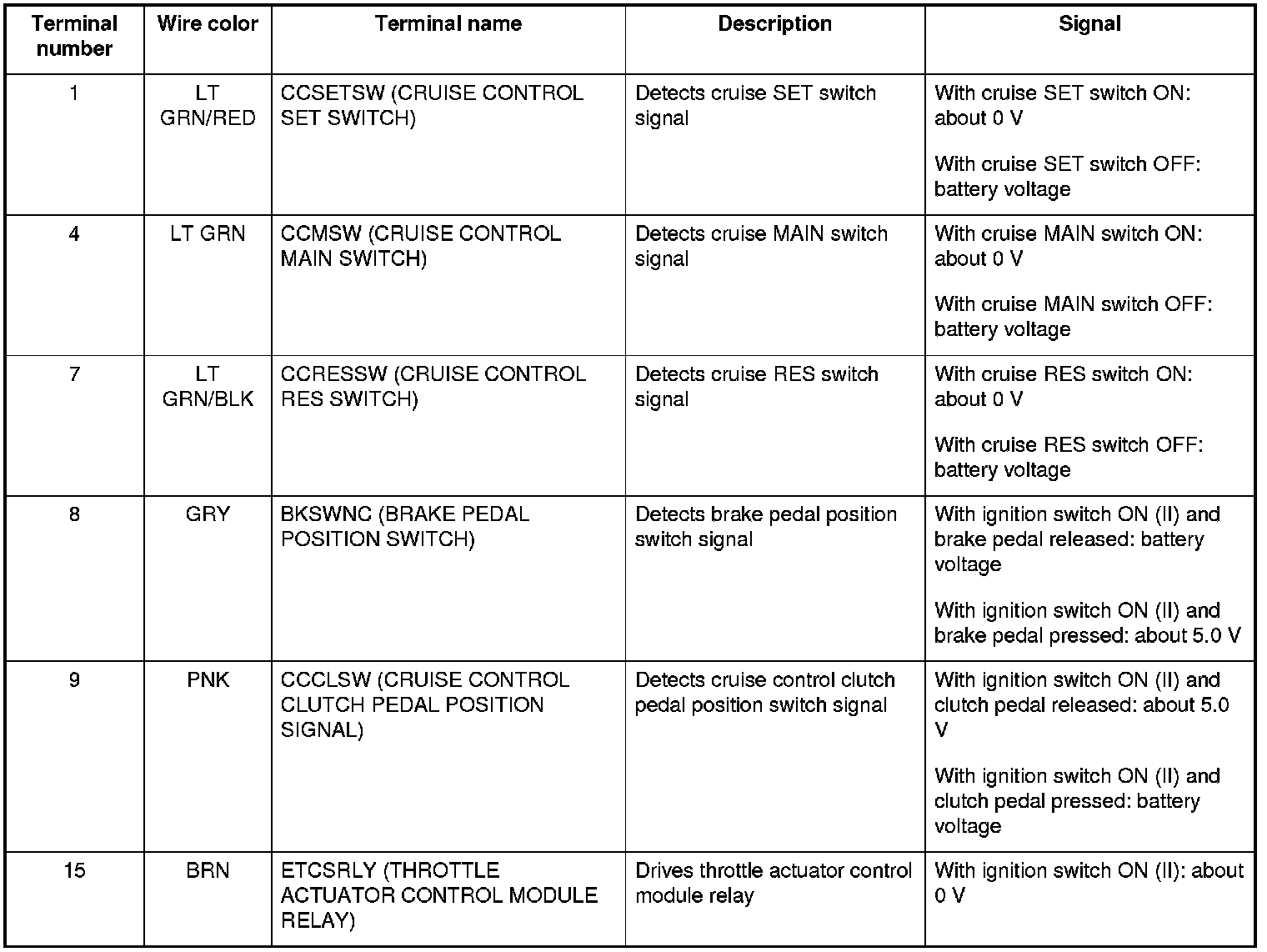 Cruise control: The ECM controls the throttle actuator to maintain the set speed when the cruise control is operating. The throttle actuator takes the place of the cruise control actuator.