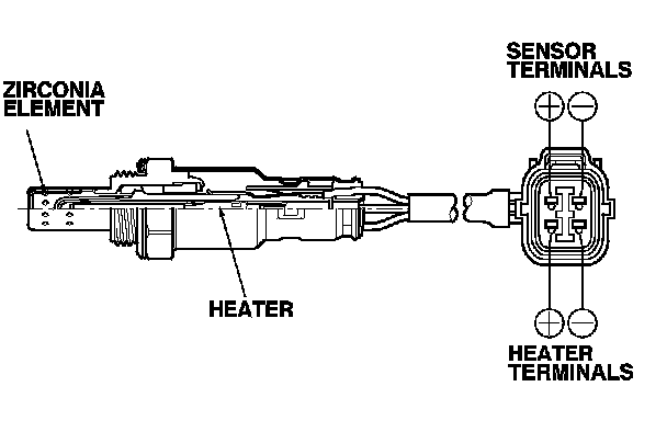 The secondary HO2S detects the oxygen content in the exhaust gas downstream of the three way catalytic converter (TWC), and sends signals to the ECM which varies the duration of fuel injection accordingly. To stabilize its output, the sensor has an internal heater. The ECM compares the HO2S output with the A/F sensor output to determine catalyst efficiency. The secondary HO2S is on the TWC.