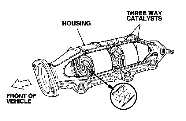 The TWC converts hydrocarbons (HC), carbon monoxide (CO), and oxides of nitrogen (NOx) in the exhaust gas to carbon dioxide (CO2), nitrogen (N2), and water vapor.
