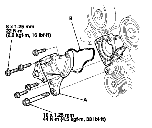Install the water pump with a new O-ring (B) in the reverse order of removal.