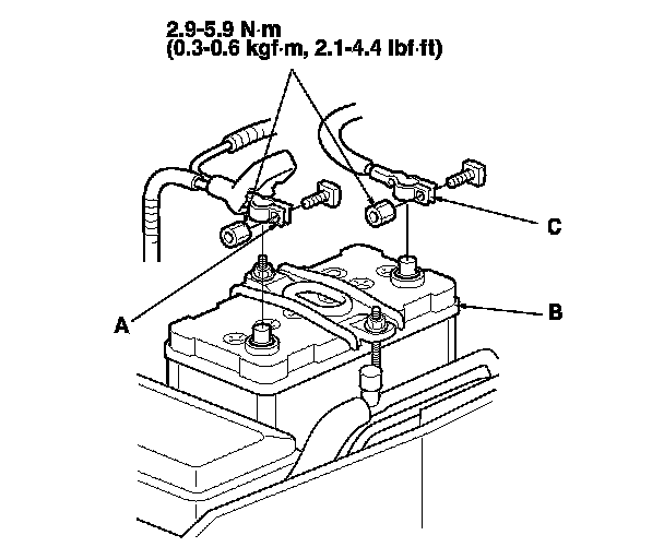 3. Reconnect the positive cable (A) to the battery (B) first, then reconnect the negative cable (C) to the battery.