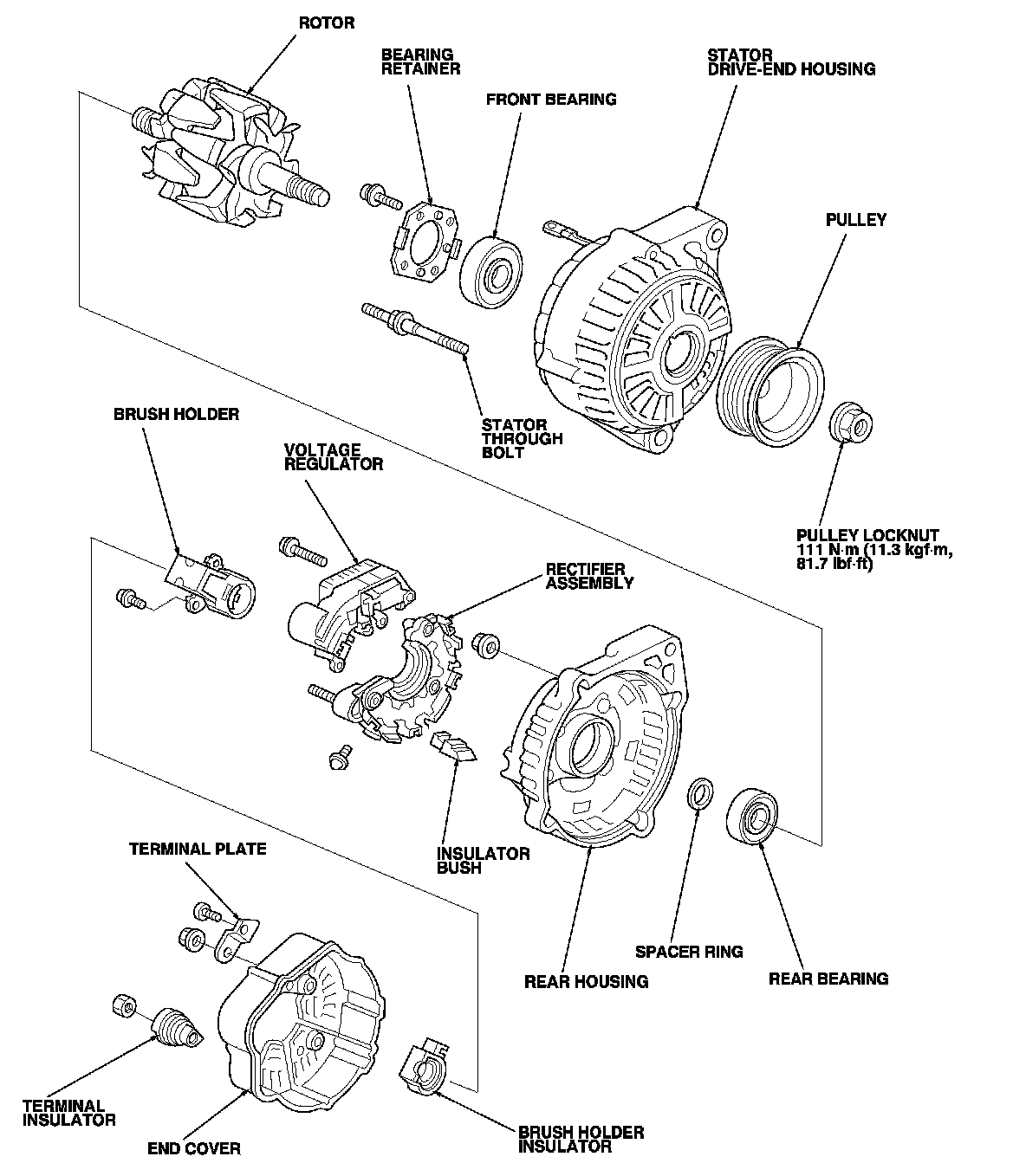24. Reassemble the alternator in the reverse order of disassembly, and note these items: