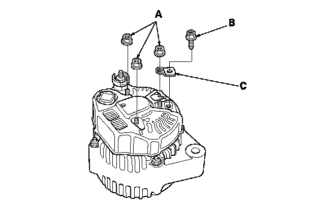 4. Remove the three flange nuts (A) and the screw (B) from the alternator, then remove the terminal plate (C).