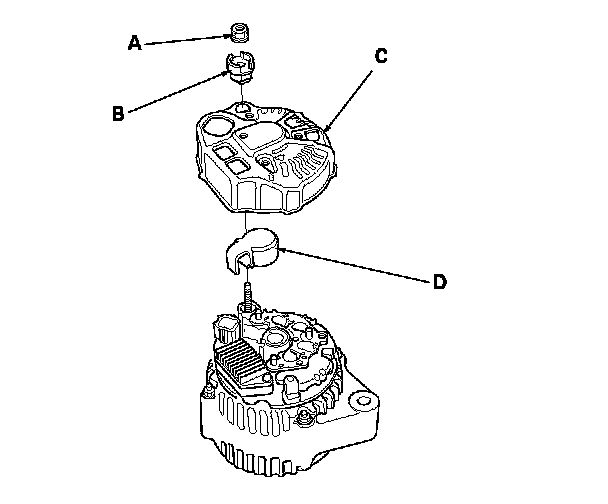 5. Remove the washer nut (A) and the terminal insulator (B) from the B terminal, then remove the end cover (C) and the brush holder insulator (D).
