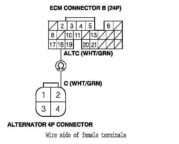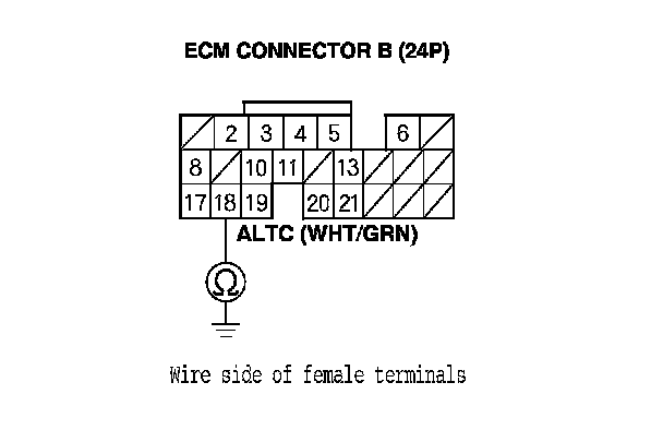 19. Check for continuity between ECM connector terminal B18 and alternator 4P connector terminal No. 2.