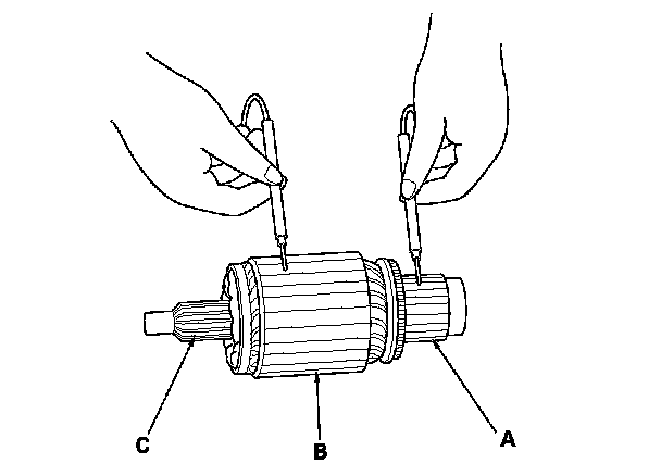 10. Check for continuity between the commutator (A) and the armature coil core (B), and between the commutator and the armature shaft (C). If there is continuity, replace the armature.