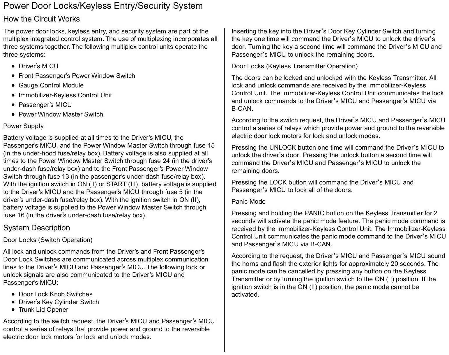 Home >> Honda >> 2010 >> Accord L4-2.4L >> Repair and Diagnosis >> Body and Frame >> Locks >> Keyless Entry >> Description and Operation >> How The Power Door Locks/Keyless Entry/Security System Circuit Works
