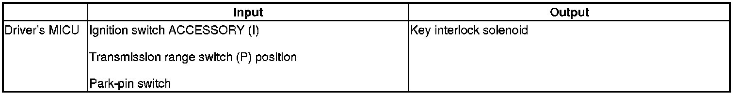 The driver's MICU control of the key interlock solenoid is based on ignition switch ACCESSORY (I) position, the transmission range switch P position, and the park-pin switch inputs.