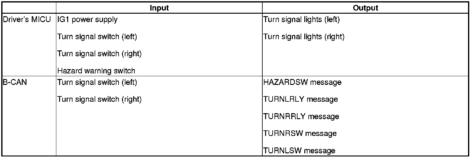 The driver's MICU control of the turn signal/hazard warning lights is based on inputs from the turn signal switch and the hazard warning switch.