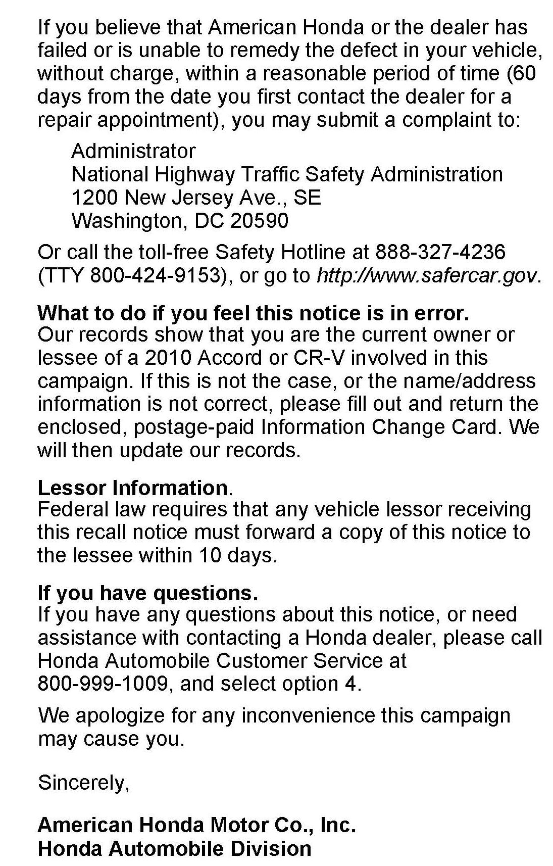 Should an unrepaired vehicle that was in inventory, or that came in for service after this service bulletin was issued, cause an injury or property damage because of the campaigned item, the dealership will be solely responsible to the damaged party, and will be required to defend and indemnify American Honda for any resulting claims.
