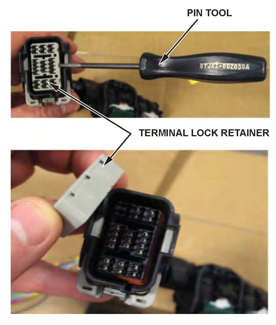 8. Using the Pin Tool (T/N 07JAZ-002050A) from the Pin Tool Set P/N 07JAZ-002000A), remove the terminal lock retainer from the engine harness connector.