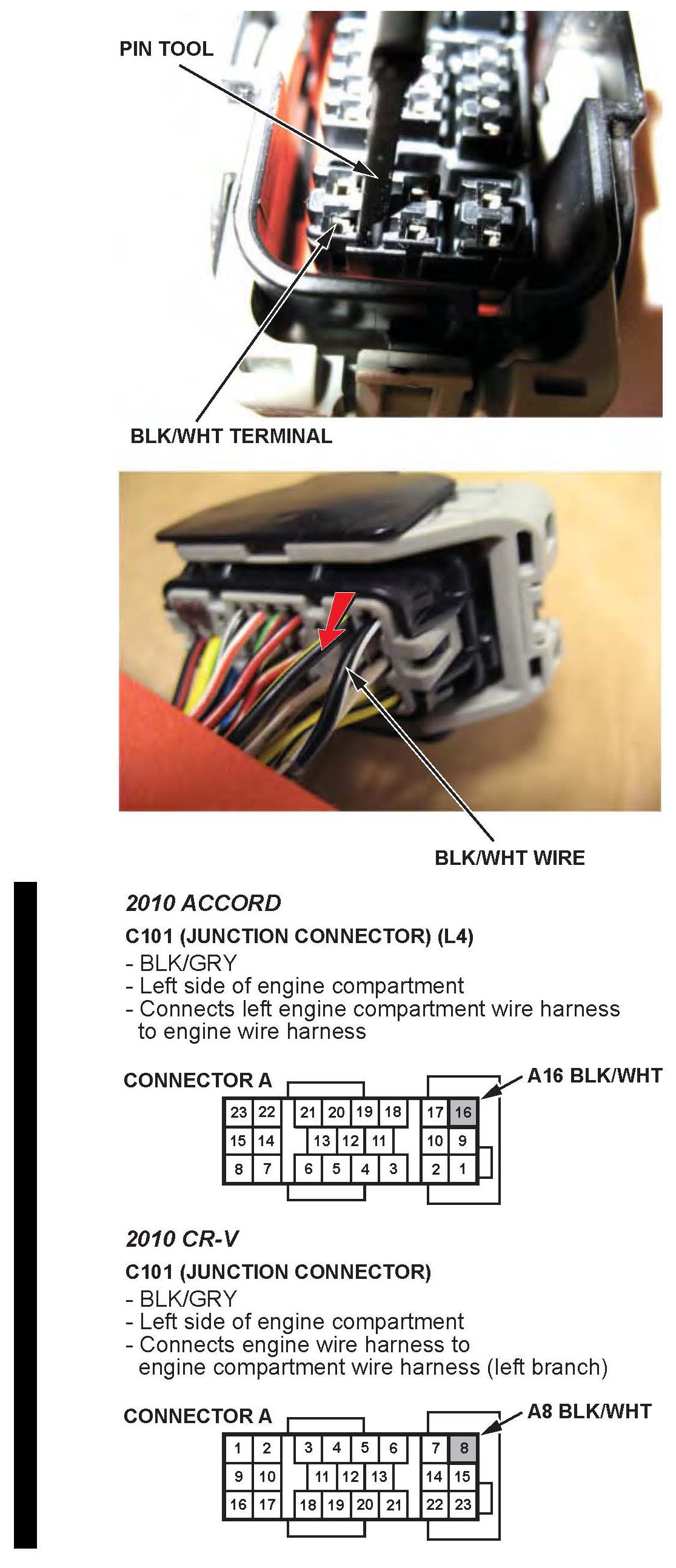 ^ For a complete list of the wire terminals and circuits in the C101 junction connector, refer to Connector Terminal View 264 in the 2010 Accord ETM, or Connector Terminal View 279 in the 2010 CR-V ETM.