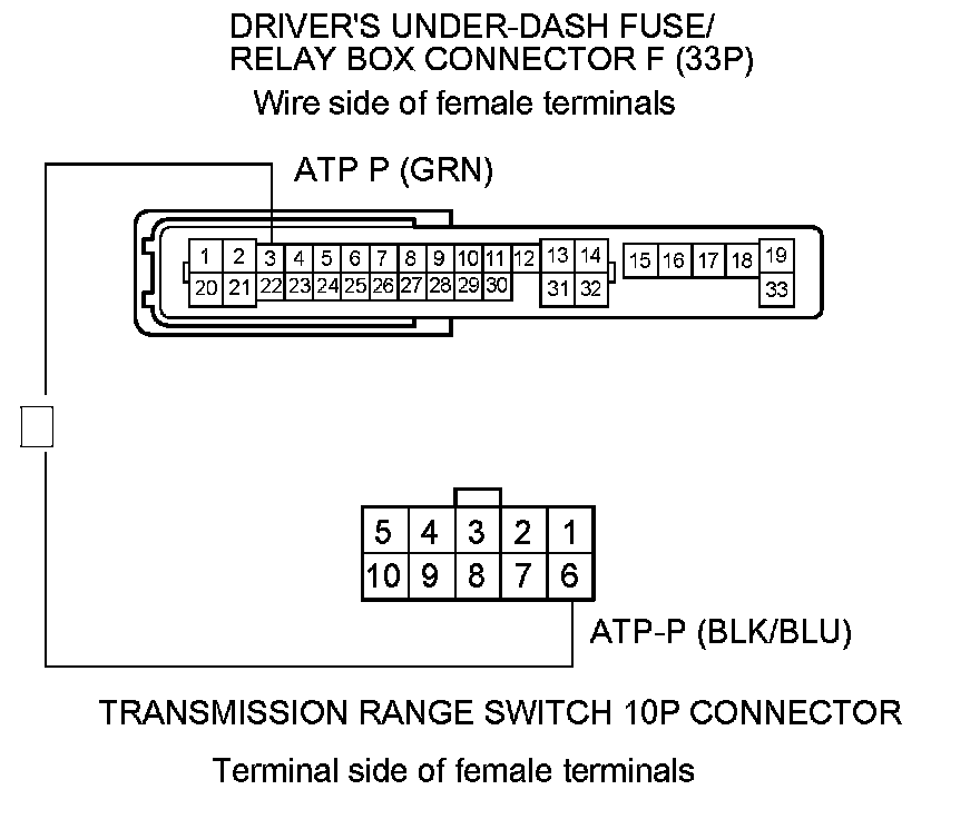 18. Check for continuity between driver's under-dash fuse/relay box connector F (33P) terminal No. 4 and transmission range switch 10P connector terminal No. 6.