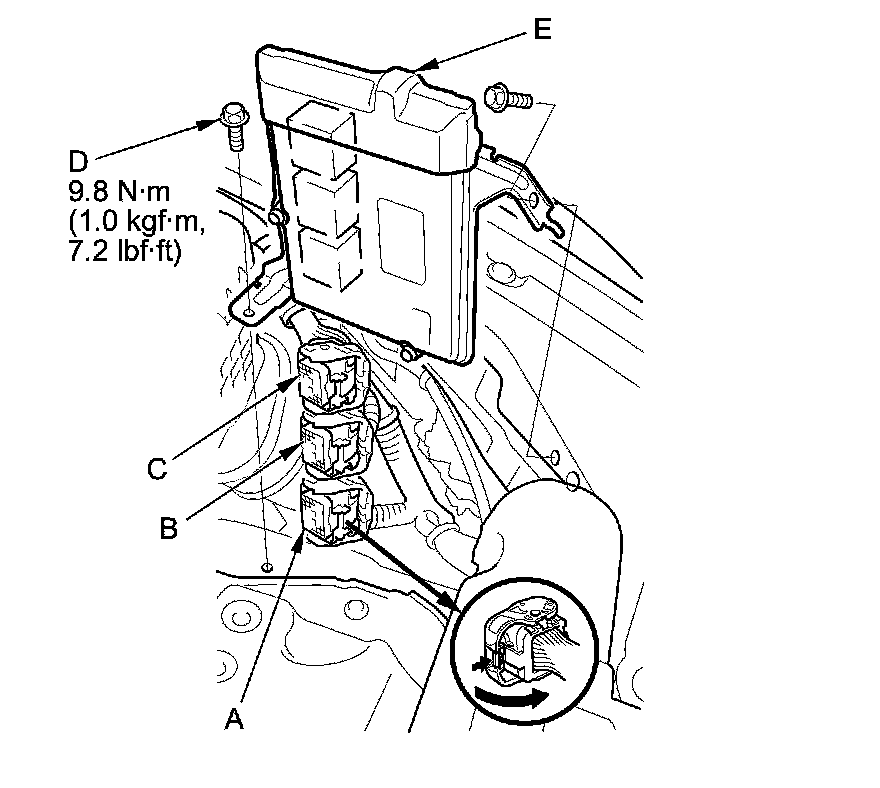 14. Disconnect ECM/PCM connectors A, B, and C, then remove the ECM/PCM assembly (E).