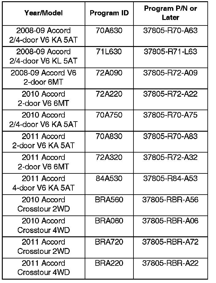 The updated PGM-FI software program IDs and P/Ns are shown in the table above. If the HDS is loaded with the latest software, and it displays No Update Needed during the update, the software for this service bulletin is already installed