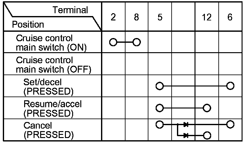 - If there is continuity, and it matches the table, but switch failure occurred on the cruise control input test, check and repair the wire harness on the switch circuit.