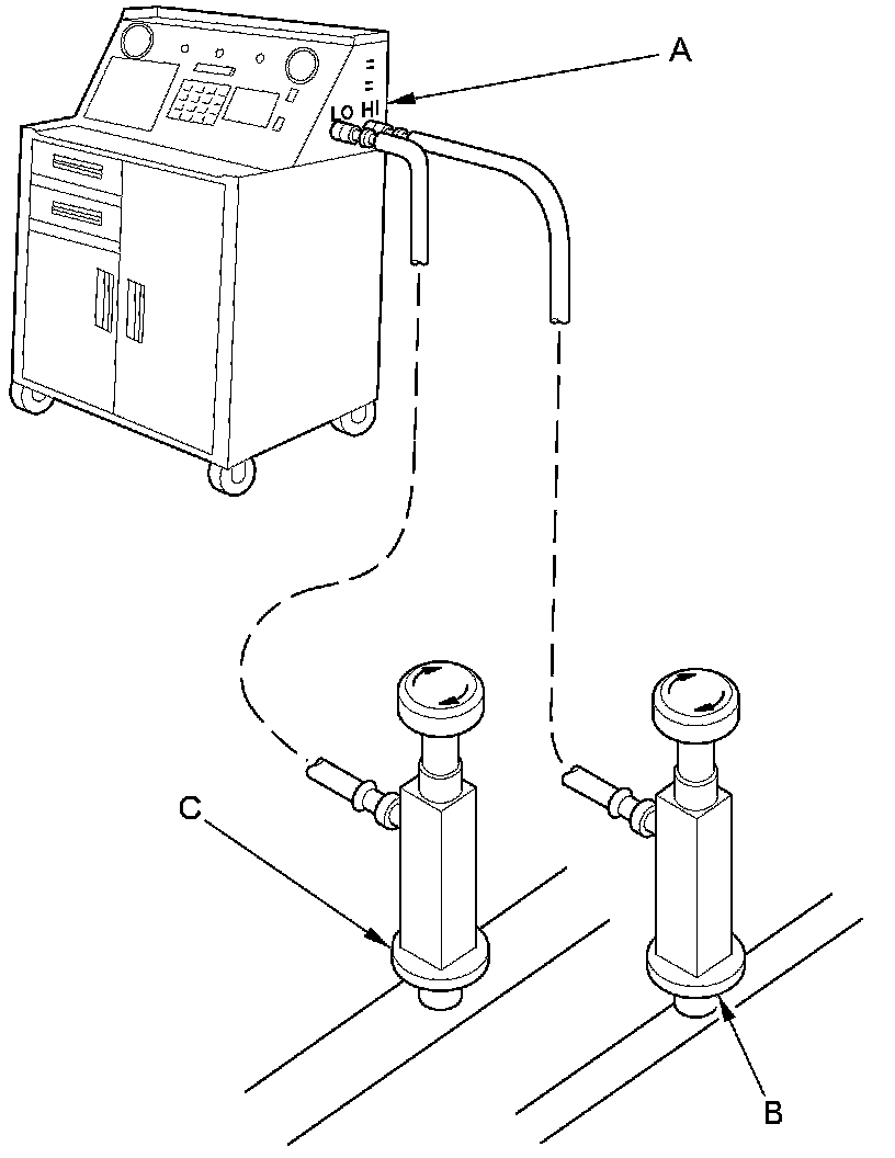 1. Connect an R-134a refrigerant recovery/recycling/charging station (A) to the high-pressure service port (B) and the low-pressure service port (C), as shown, following the equipment manufacturer's instructions.