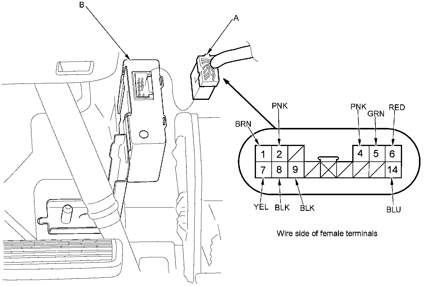 2. Disconnect the 14P connector (A) from the automatic lighting control unit (B).