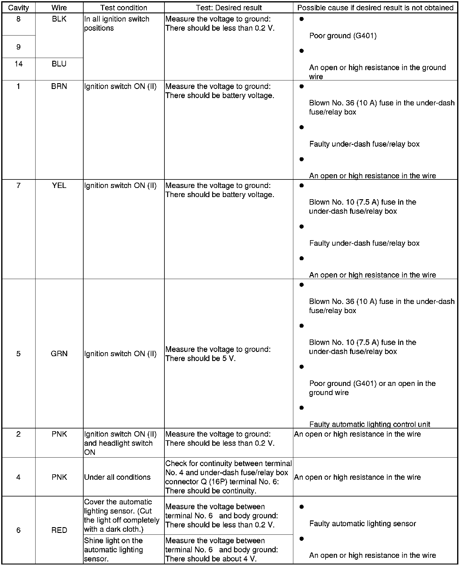 4. Reconnect the automatic lighting control unit connector, then do the following input tests.