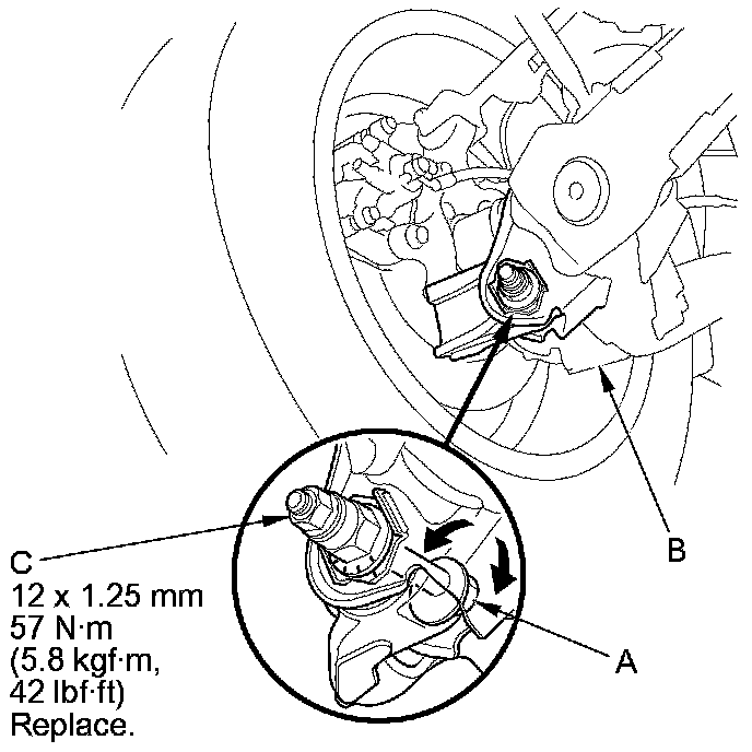 3. Hold the adjusting bolt (A) on the trailing arm (B), and remove the self-locking nut (C).