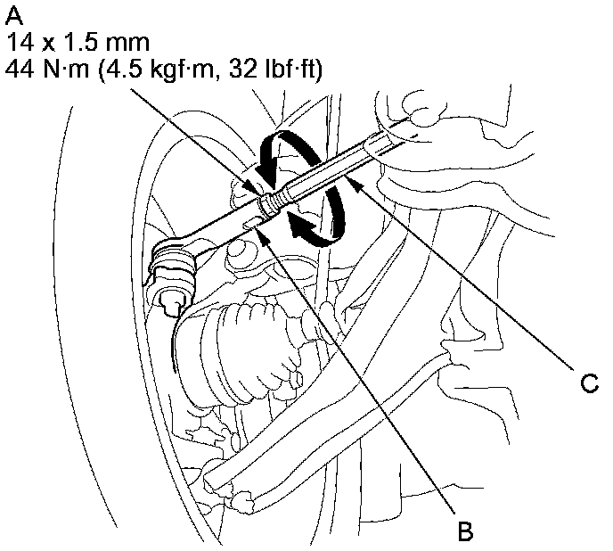 3. Loosen the tie-rod locknuts (A) while holding the flat surface sections (B) of the tie-rod end with a wrench, and turn both tie-rods (C) until the front toe is within specifications.