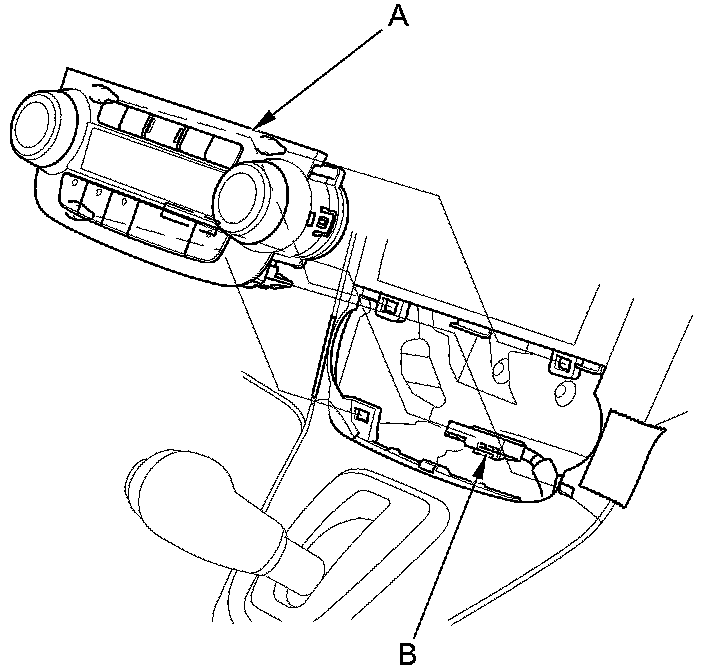 4. Remove the climate control unit (A). Disconnect the connector (B).