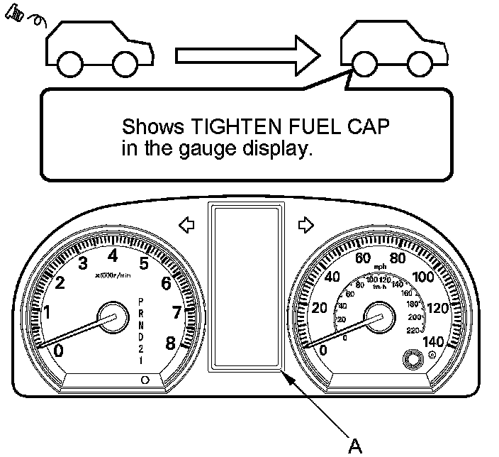 The first time a leak is detected, a TIGHTEN FUEL CAP (multi-information display model) (CHECK FUEL CAP (odometer/outside temperature display model)) message appears on the gauge display (A). To scroll to another message, press the select/reset button. The TIGHTEN FUEL CAP/CHECK FUEL CAP message appears each time you restart the engine until the system turns the message off. Turn the engine off, then replace or tighten the fuel fill cap until it clicks at least once.