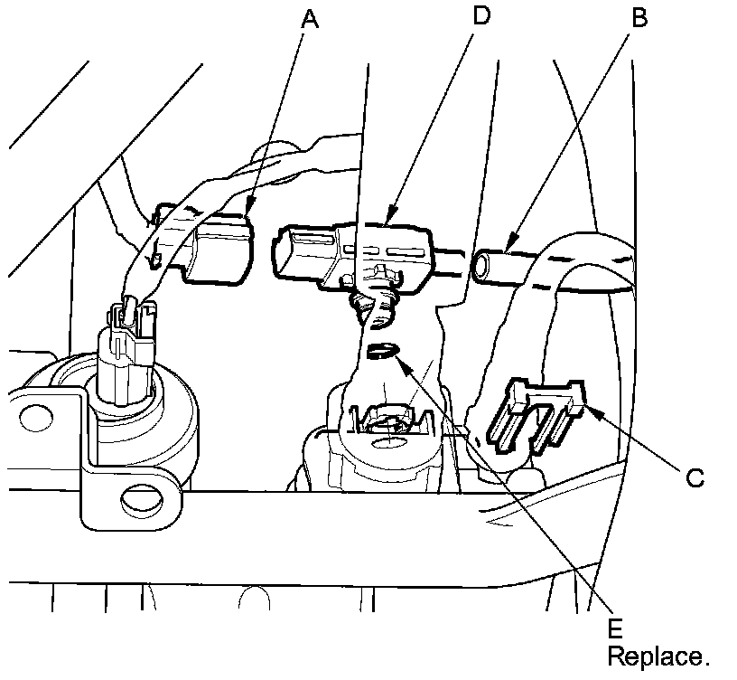 6. Install the parts in the reverse order of removal with a new O-ring (E) and a new retainer.