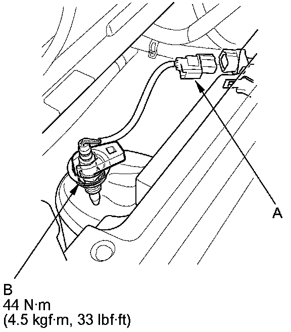 1. Disconnect the A/F sensor 4P connector (A), then remove the A/F sensor (B).
