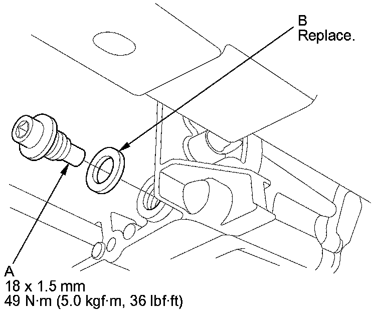 7. Reinstall the drain plug with a new sealing washer (B).