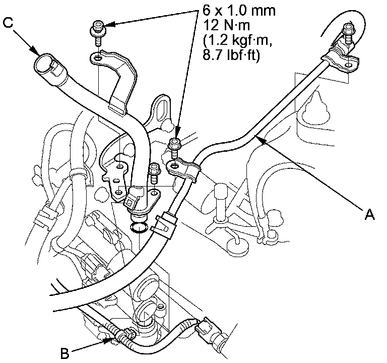 12. Remove the harness clamp (B), and remove the ATF dipstick guide tube (C).