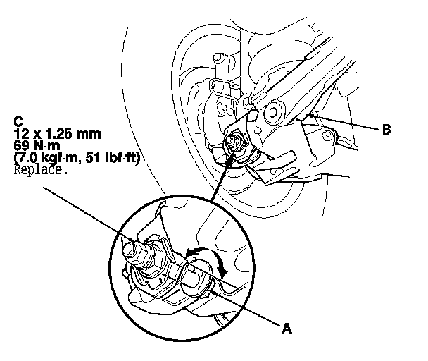 3. Hold the adjusting bolt (A) on the trailing arm (B), and loosen the self-locking nut (C).