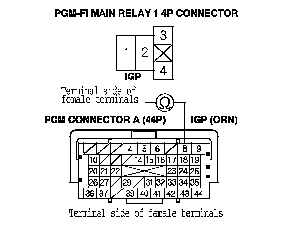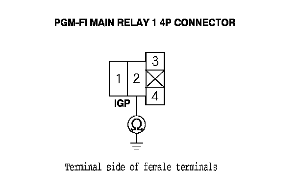 39. Check for continuity between body ground and PGM-FI main relay 1 4P connector terminals No. 1 and No. 3 individually.