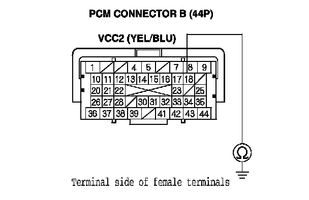 68. Check for continuity between body ground and PCM connector terminals B1, B36, C2, C40, and C44 individually.