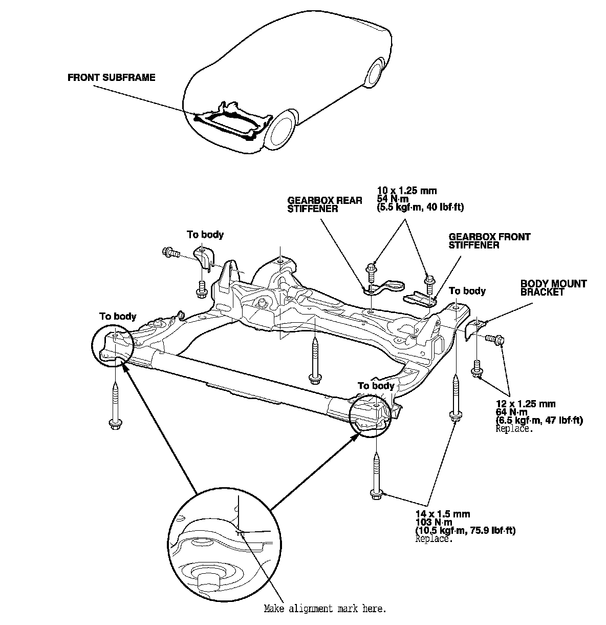 - After mounting the subframe and brackets loosely, align the reference marks with the body, then tighten the bolts.