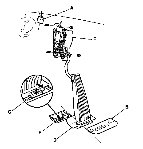 3. Push the tab (C), and remove the accelerator pedal pad (D) from the pedal stop (E).