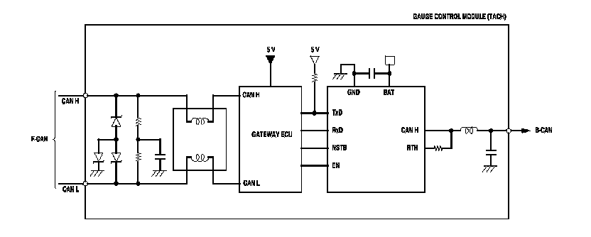 The body controller area network (B-CAN) and the fast controller area network (F-CAN) share information between multiple electronic control units (ECUs). B-CAN communication moves at a slower speed (33.33 kbps) for convenience related items and for other functions. F-CAN information moves at a faster speed (500 kbps) for "real time" functions such as fuel and emissions data. To allow both systems to share information, the gauge control module translates and relays the information from B-CAN to F-CAN and from F-CAN to B-CAN. This is called the Gateway Function.