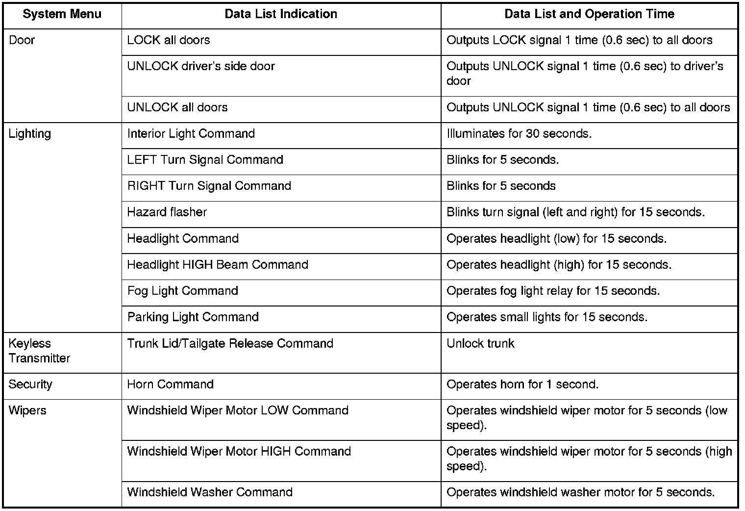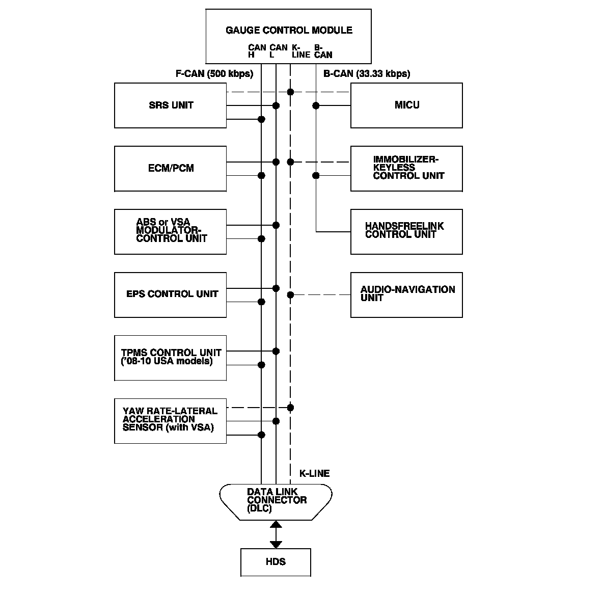 By connecting the HDS to the data link connector (DLC), the HDS can retrieve the diagnostic results from the MICU via a diagnostic line called the K-LINE. The K-LINE is a separate communication line from the CAN lines, and it is connected to most of the CAN related ECUs. The MICU is a gateway between the HDS and B-CAN related ECUs, and sends B-CAN diagnostic information to the HDS. When doing a function test with the HDS, the HDS sends an output signal through the K-LINE to the MICU. The MICU either relays the request to another ECU, or commands the function itself.