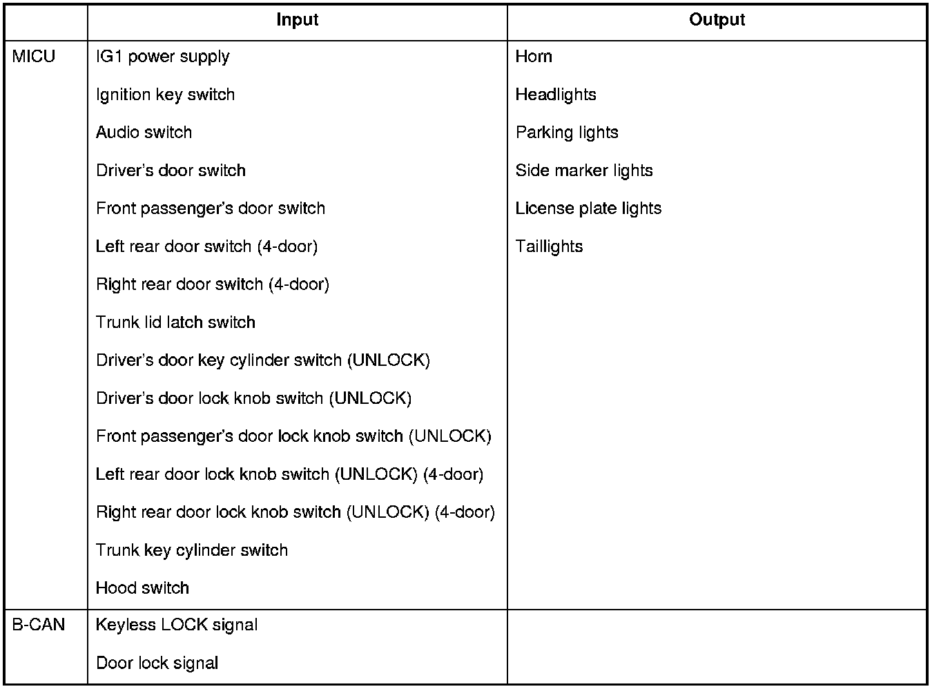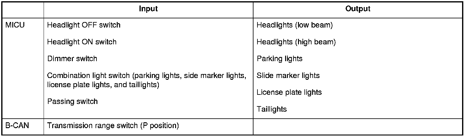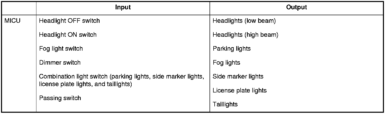 The MICU contains the relay circuits of the headlight high/low beam and taillights, and controls the lighting system ON/OFF based on inputs from the combination light switch.