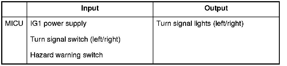 The MICU control of the turn signal/hazard warning lights is based on inputs from the turn signal and hazard warning switches.