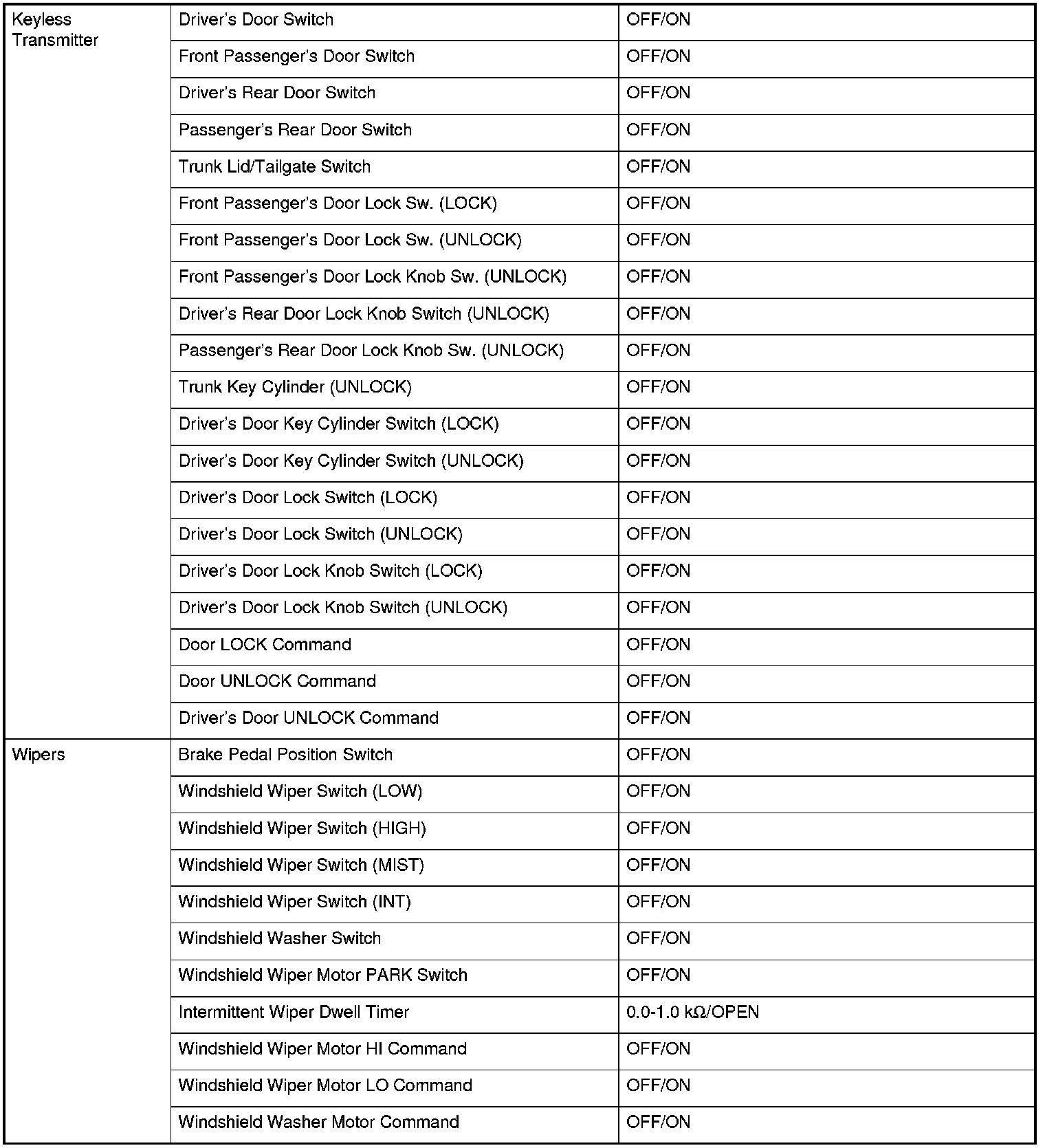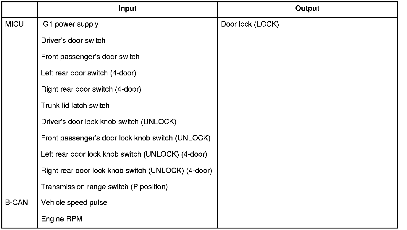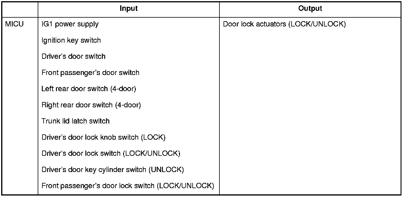 The MICU control of the door lock actuators is based on ignition key switch, driver's door switch, and driver's door lock knob switch inputs.