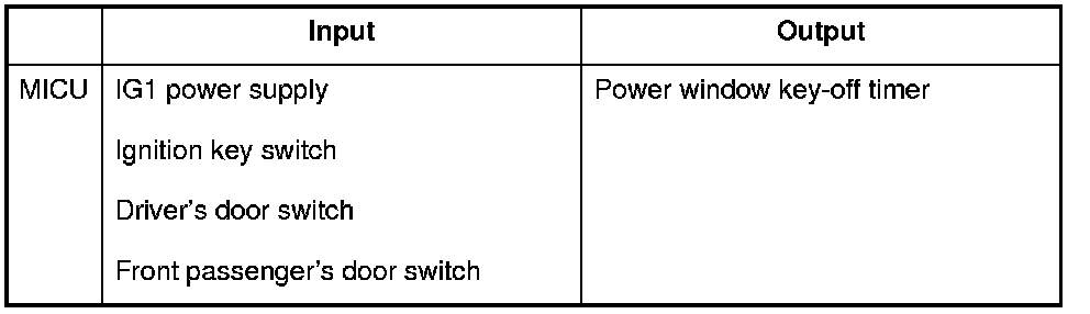 The MICU control of the power windows key-off operation is based on inputs from each switch.