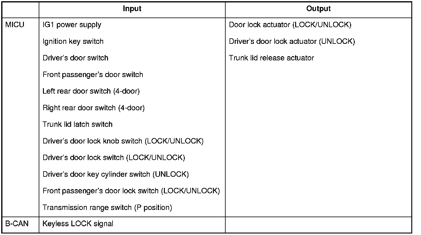 The MICU control of the door lock actuators is based on inputs from each switch and the B-CAN data.