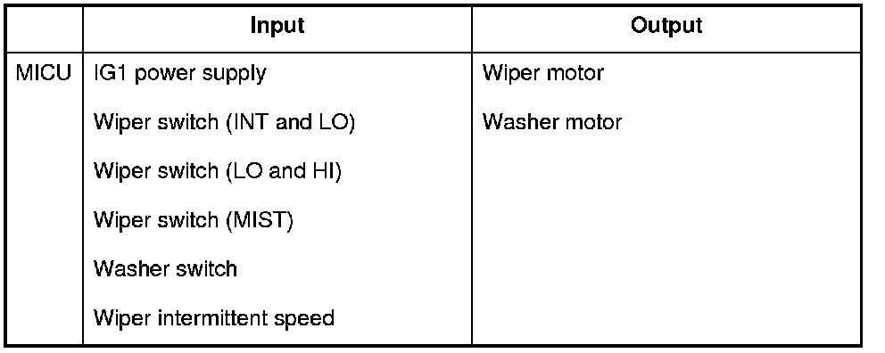 The MICU control of the windshield wiper motor and the windshield washer motor is based on IG1 and wiper/washer switch inputs.