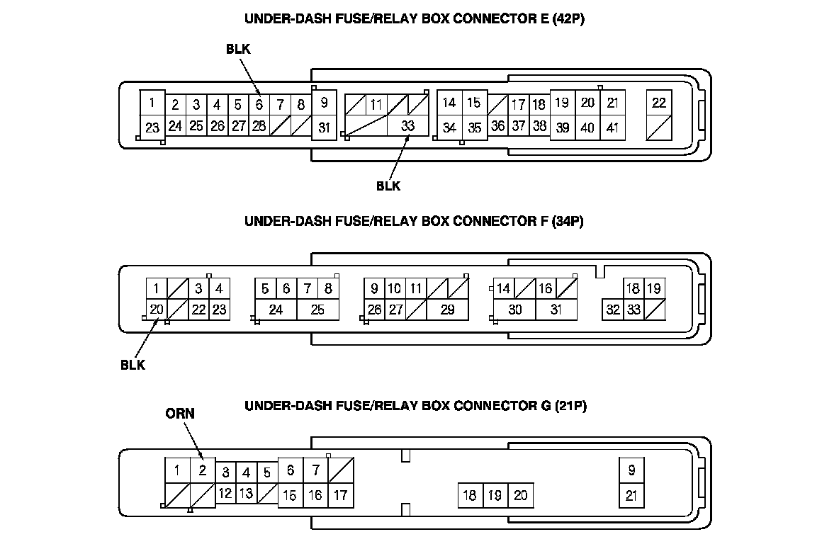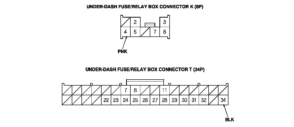 2. Disconnect under-dash fuse/relay box connectors E, F, G, K, and T.