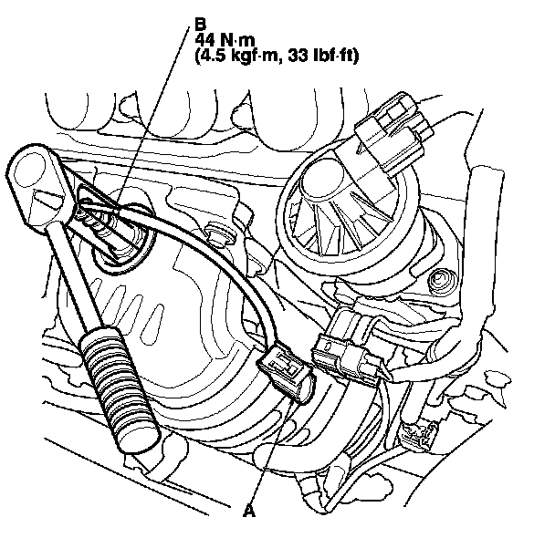 1. Disconnect the A/F sensor 4P connector (A), then remove the A/F sensor (B).