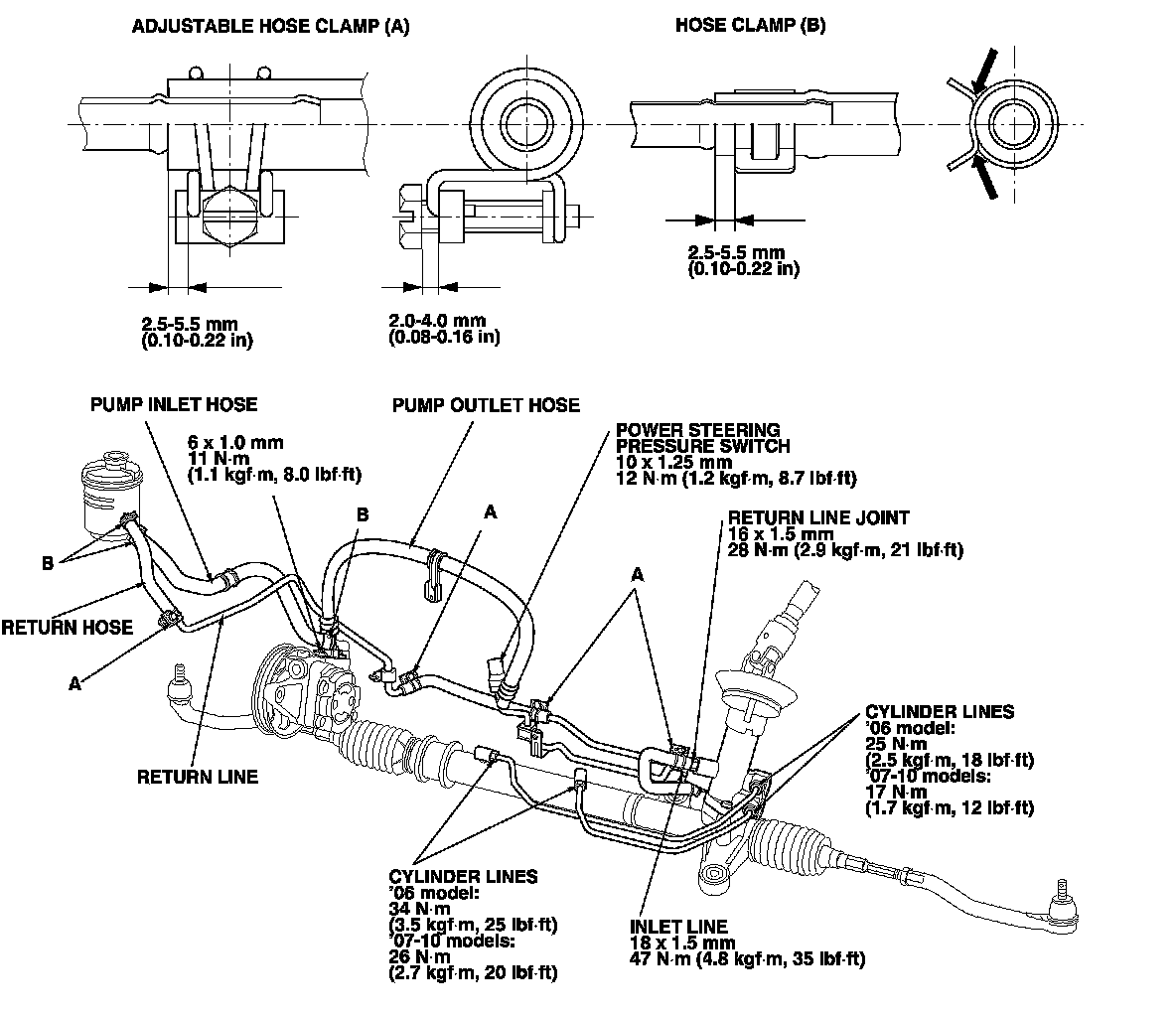 - Connect each hose to the corresponding line securely until it contacts the stop on the line. Install the clamp or adjustable clamp at the specified distance from the hose end as shown.