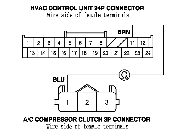 K20Z3 engine: Check for continuity between HVAC control unit 24P connector terminal No. 11 and A/C compressor clutch 3P connector terminal No. 3.