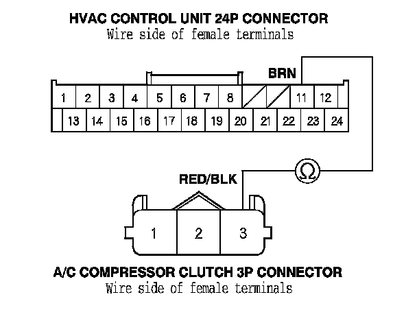 13. R18A1 engine: Check for continuity between HVAC control unit 24P connector terminal No. 11 and A/C compressor clutch 3P connector terminal No. 1.
