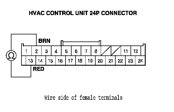 15. Measure the evaporator temperature sensor resistance between HVAC control unit 24P connector terminals No. 2 and No. 13.
